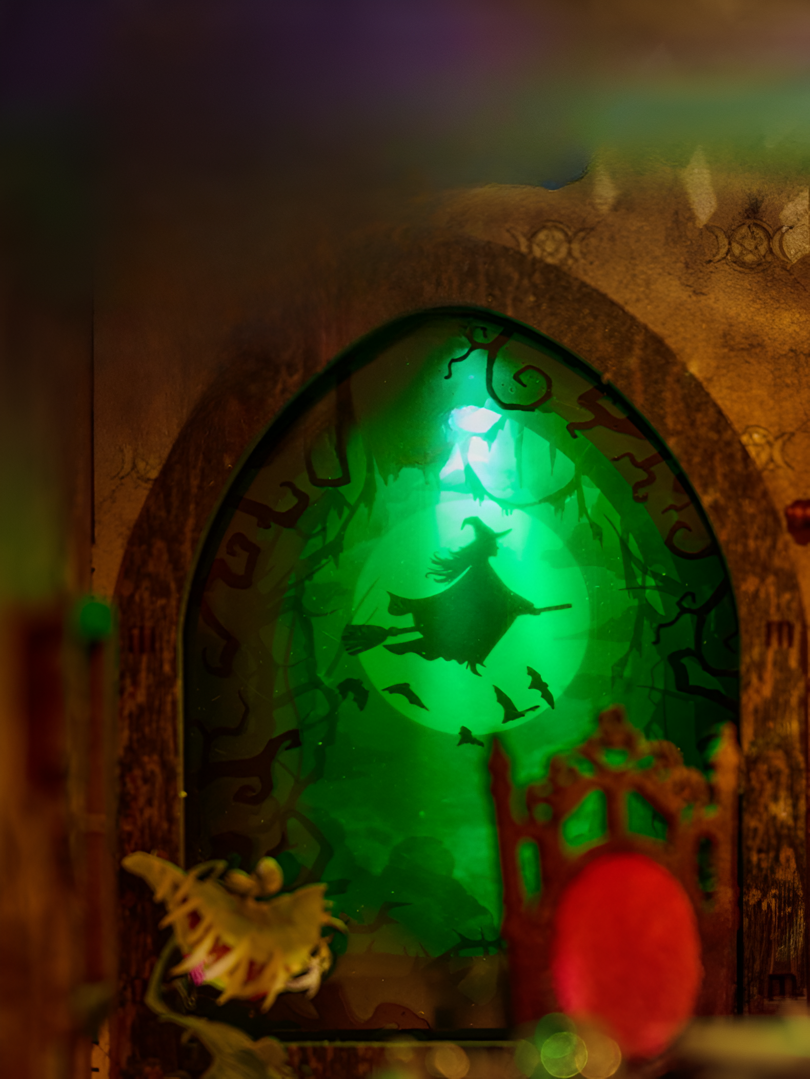 Intricate Detailing: Every tiny element — from the witch’s lantern to the rustic shutters — tells part of the story.